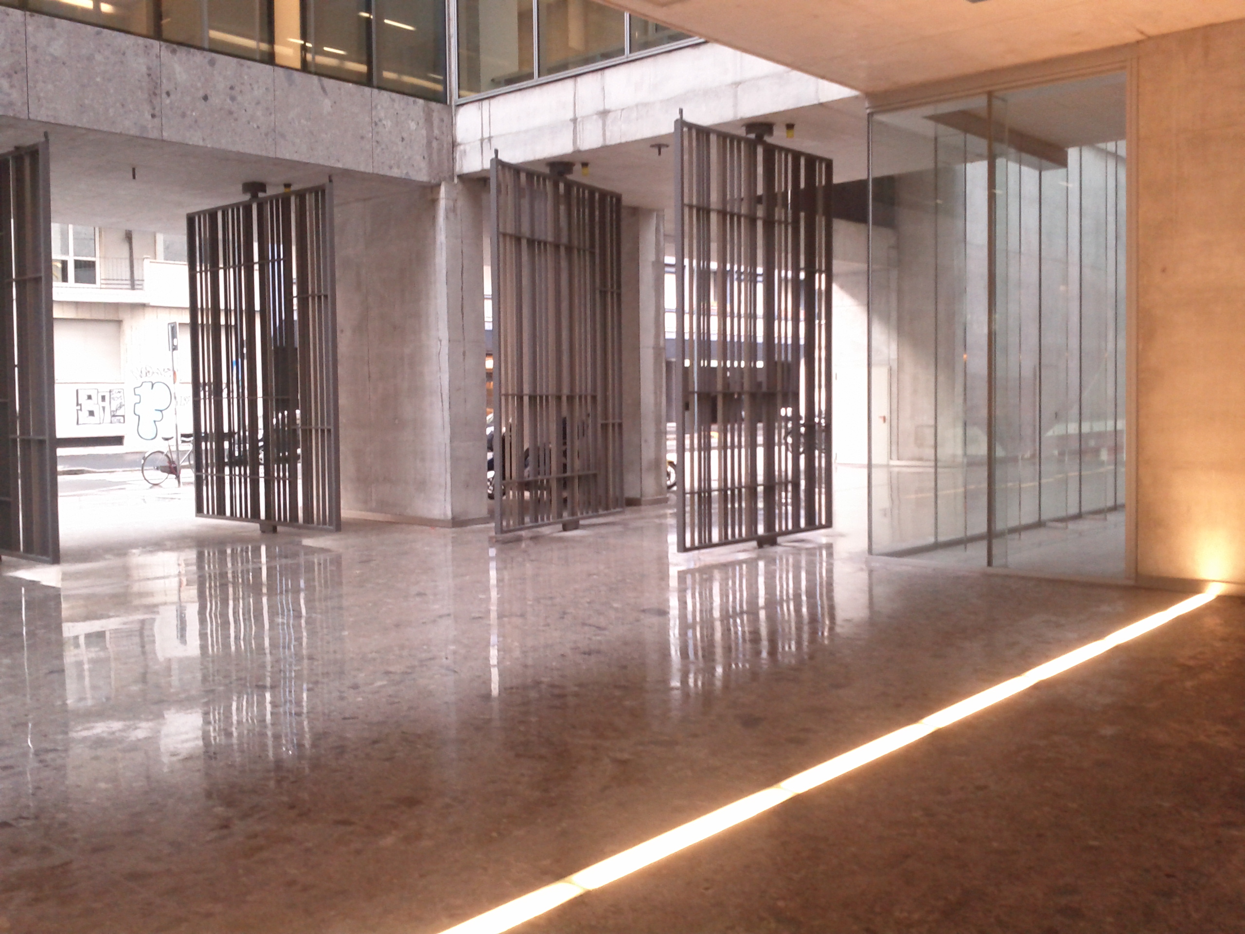 As promised in a previous post I made some rigorously unprofessional pictures of this beautiful building, in a Spring rainy day light. Pictures are taken with my android in the open public space around the building. Despite the bad quality I think they might give an idea of how massive built volumes and transparency, geometric shapes and accidental urban fabric work together well. By the way, to my knowledge this is the only building in Milan without graffiti. It might be because Bocconi School  has an excellent defense system, but I like to think of a kind of respect by the writers.