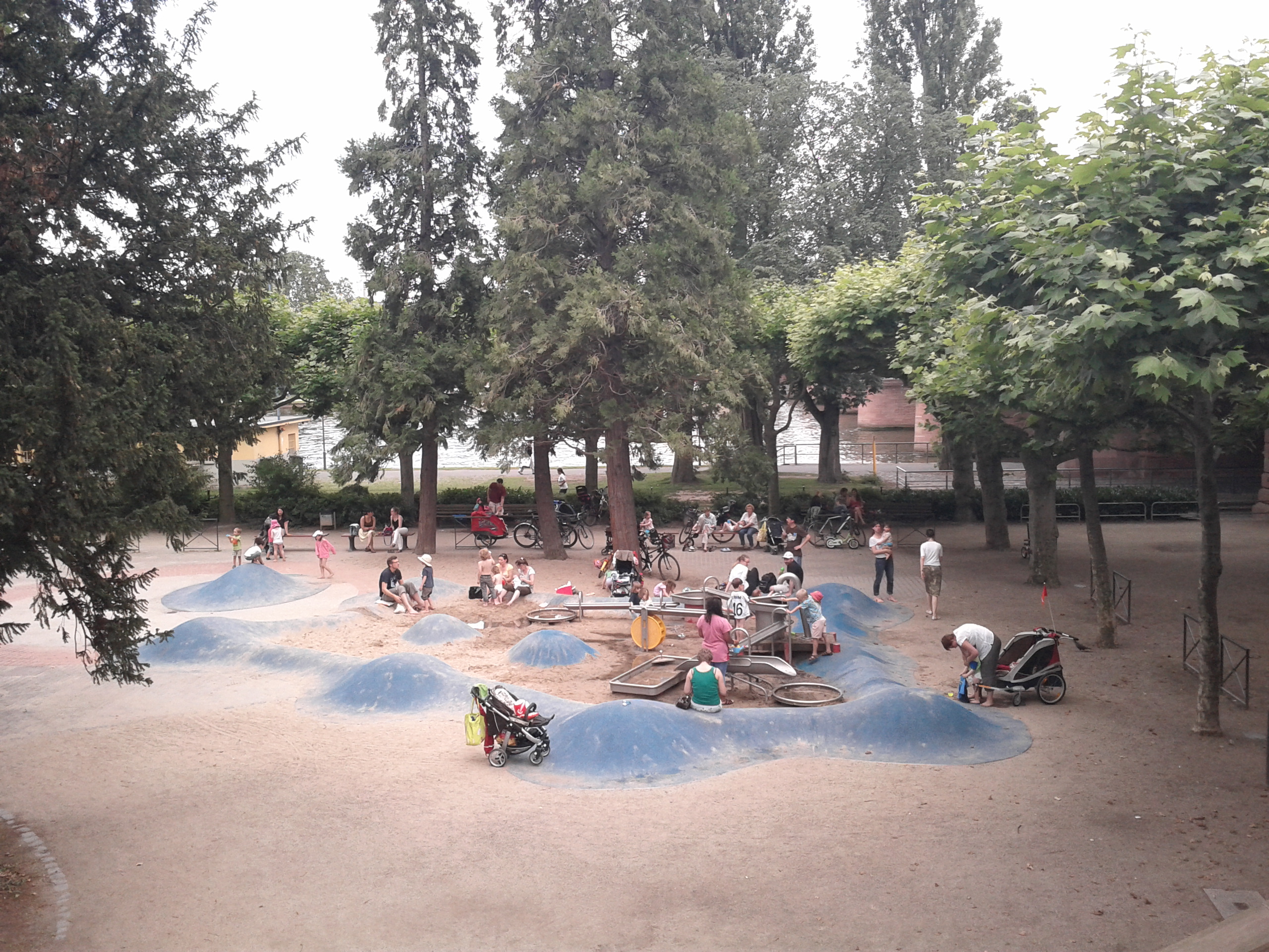 This is something I really miss from Germany: the possibility to seat on nice bank along the street, have a quick apfelwein (or two…) and continue my walk. Luckily in Milan I can often enough enter a nice bar and have a good coffee. Below a playground for children along the Main river.