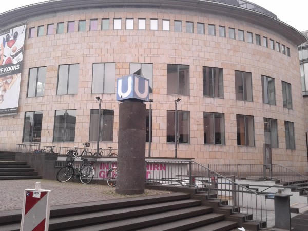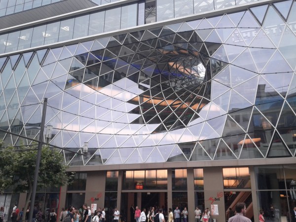 This is another department store on the Zeil, one of the most unnecessary and pointless buildings I have ever seen (by Massimiliano Fuksas). Not to talk about how this hole ( a formal exercise borrowed by the roof construction of the new fairground in Milan, where it has a fully other dimension and sense) this glazed hole makes the facade unfit to the most common weather conditions (snow, wind and rain comes through with consequences that are easy to imagine). Most aberrantly this facade also makes any reasonable brand communication or visual link between the inner space and the public space outside impossible. Better take a bike taxi to the train station and head back home.