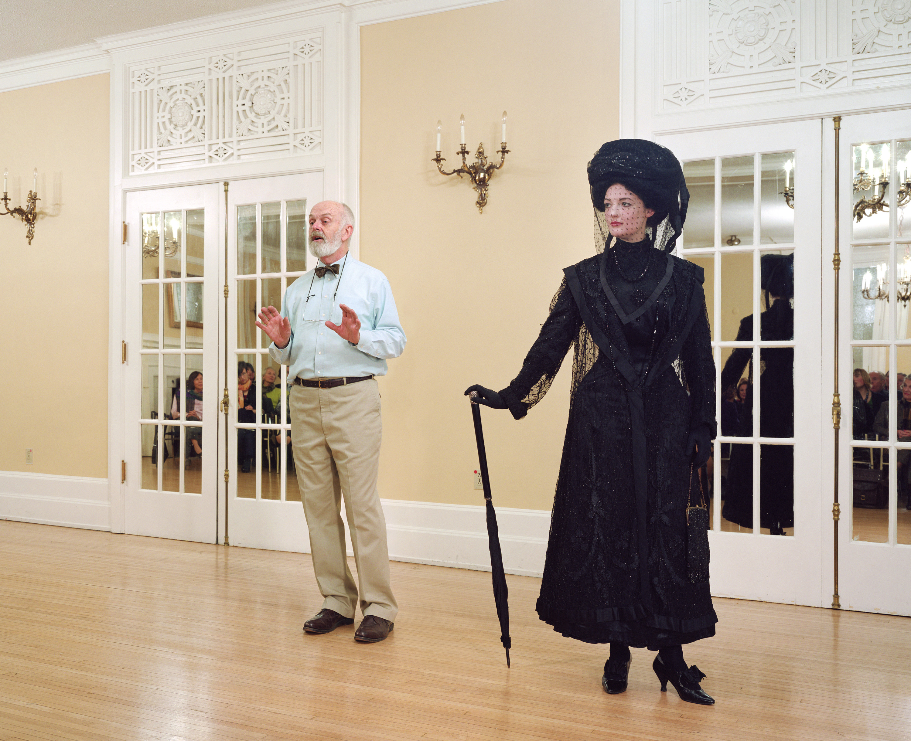 Jeff Wall, Vancouver, 7 Dec. 2009. Ivan Sayers, costume historian, lectures at the University Women’s Club. Virginia Newton-Moss wears a British ensemble c. 1910, from Sayers’ collection, 2009, colour photography, 224.3 x 182.5 cm, Courtesy of the artist